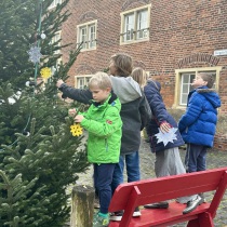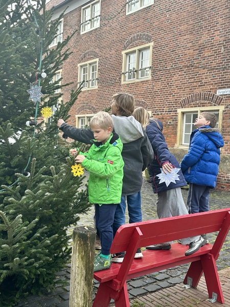 Der Baum auf dem Burgplatz erstrahlt nun in bunten Farben und lädt alle dazu ein, sich an der weihnachtlichen Stimmung zu erfreuen. Als Dankeschön für ihr Engagement erhielten die Kinder einen „Lichtblicke-Stern“ der Bäckerei Mensing.